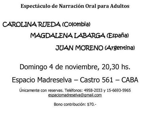 Domingo 04/11/2012 - Espectáculo de Narración oral para adultos: Carolina Rueda / Magdalena Labarga / Juan Moreno